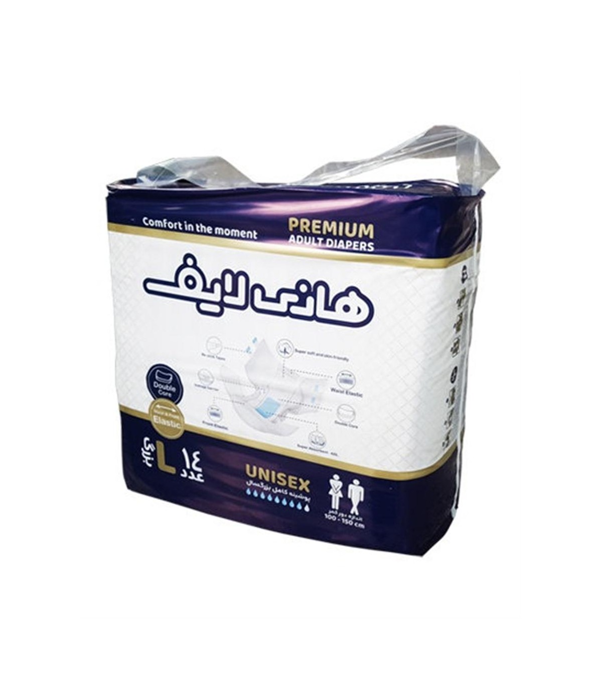 وجود نوار های کشسان در قسمت جلو و کمر جهت انعطاف بیشتر و جلوگیری از نشتی لایه بیرونی ابریشمی فوق العاده نرم دارای دو هسته ی جاذب اندازه دور کمر 100-150 سانتی متر