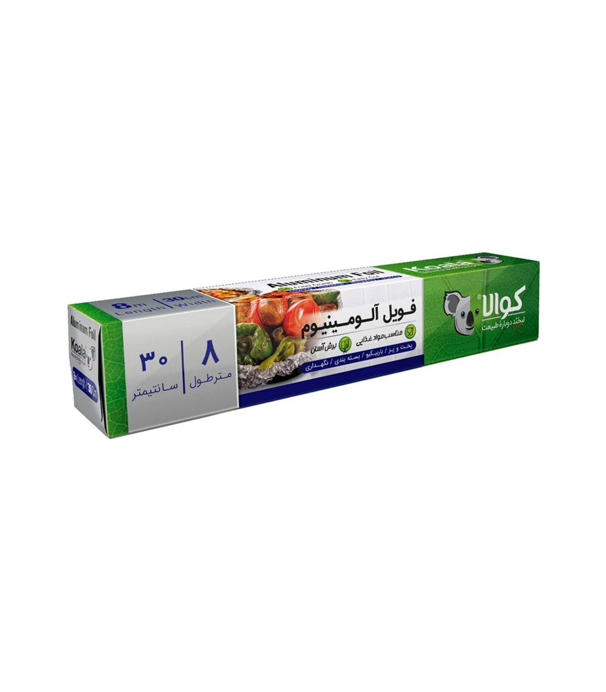 فویل الومینیوم کوالا طول 8 متر , عرض 30 س م مناسب پخت و پز و گریل کردن و فریز نمودن مواد غذایی بسته بندی و محافظت غذا از بو و رطوبت محیط پختن شیرینی و کباب کردن و دارای ضخامت متوسط