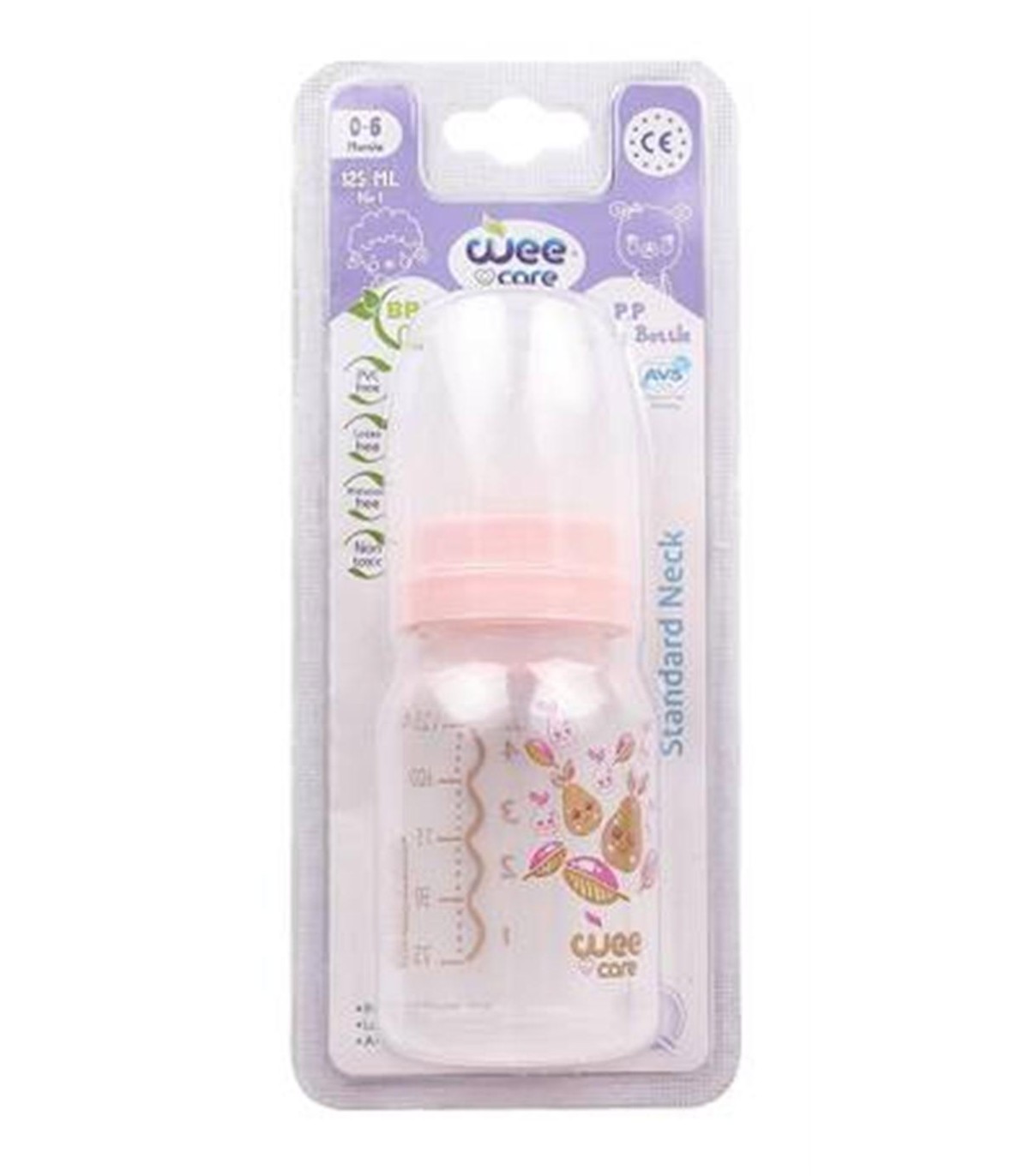 شیشه شیر خوری 120 میلی لیتر دهانه استاندارد ( تا 6 ماه ) وی کر دارای سر شیشه سیلیکونی است. دارای سرپوش جهت محافظت از آلوده شدن سر شیشه می باشد. دارای سرپیچ جهت نگهداری سر شیشه و اتصال به بطری می باشد. جنس بطری پلی پروپیلن است. سایز سوراخ سر شیشه به شکل (o) و مناسب با رشد و سن کودک است و به راحتی در کام بالایی دهان (سق) قرار میگیرد. خطوط موجود بر روی سر شیشه از روی هم افتادگی و چسبندگی آن جلوگیری میکند و همچنین سرعت عبور شیر را کم کرده و باعث حرکت آسان زبان کودک میشود. سیستم خروج هوا، ورود هوا را به دهان کودک کاهش میدهد و از علت احتمالی نفخ جلوگیری میکند. دارای قابلیت انعطاف پذیری به شکل فنر در جهات مختلف شبیه سینه مادر است.