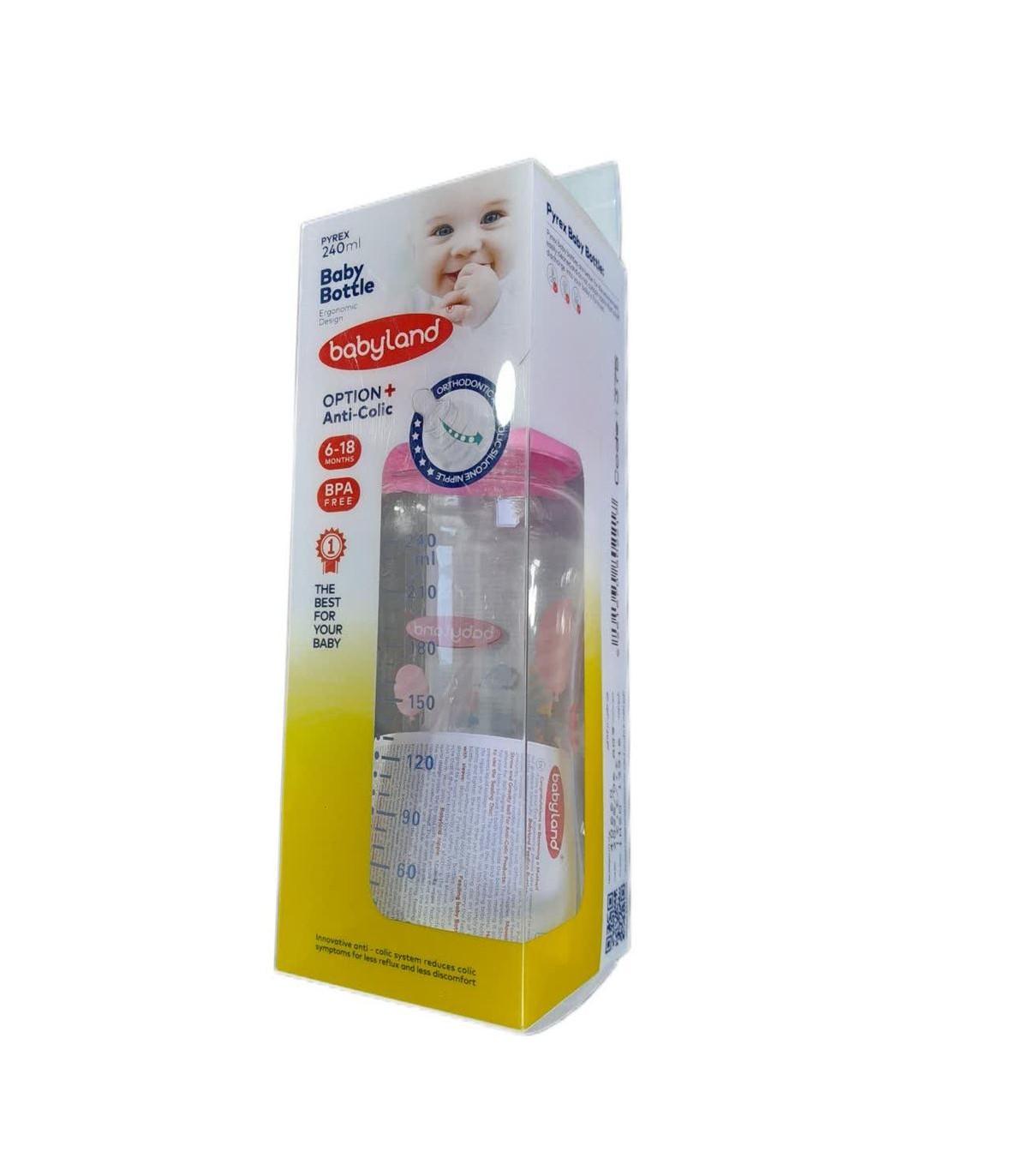 شیشه شیر خوری 240 میل پیرکس کاوردار ارتودنسی صورتی ( 18-6 ماه) بی بی لند